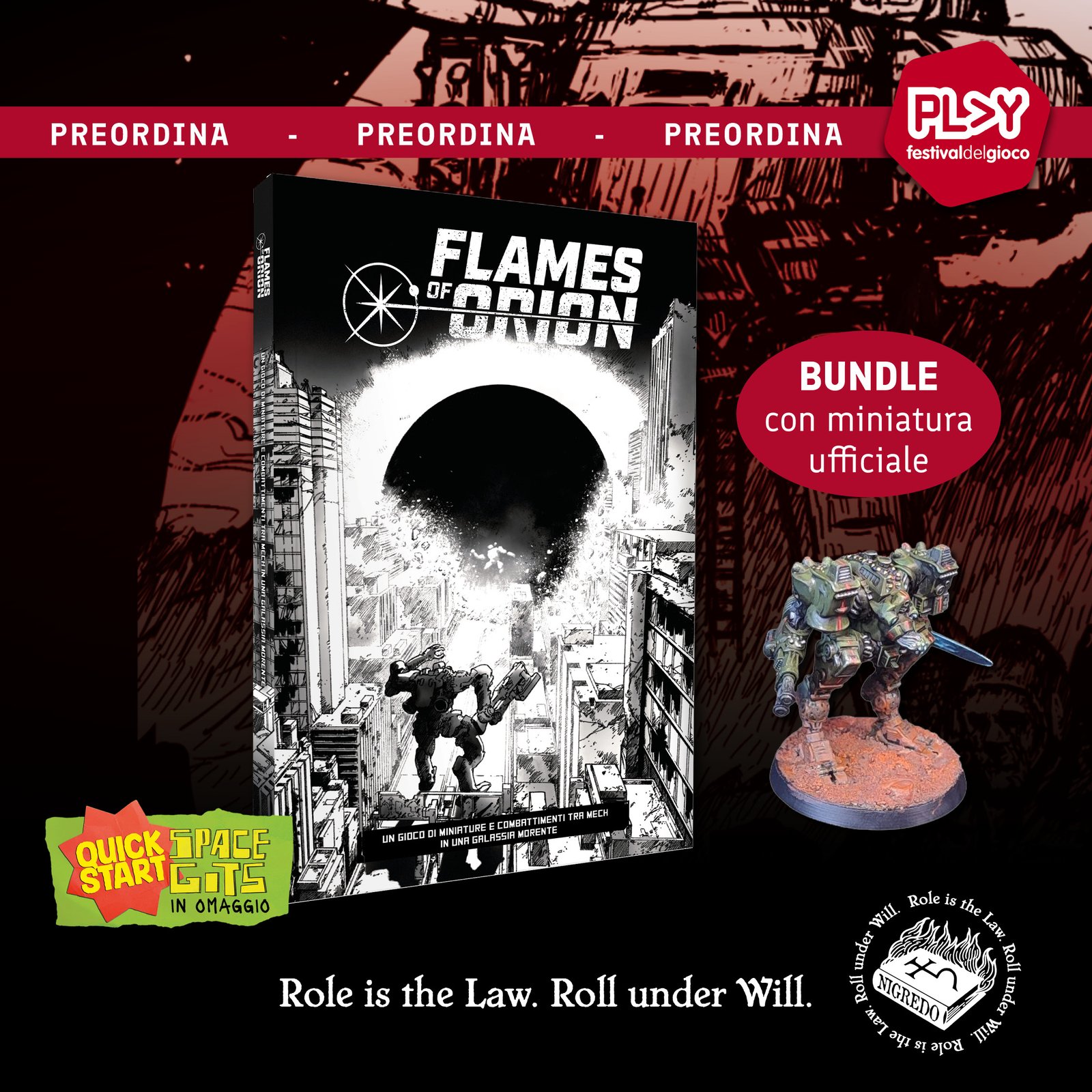 Questo Bundle di Flames of Orion ti permetterà di ottenre al miniatura ufficiale del Mech “Volontà di Dio” a un prezzo scontato!